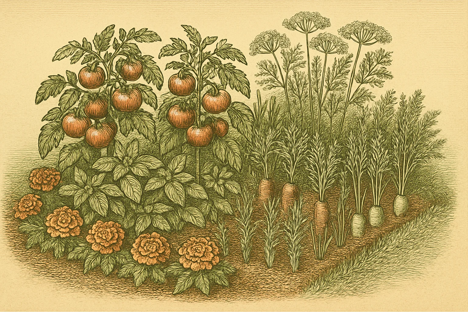 | Tomatoes | Marigolds | French marigolds (Tagetes patula) suppress root-knot nematodes when grown the prior season. Use as a rotation crop, not just interplanted. |